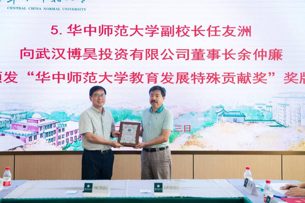 任友洲向余仲廉頒發(fā)“華中師范大學(xué)教育發(fā)展特殊貢獻獎”獎牌