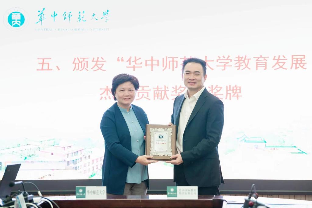 儀式上,愛圣國際教育集團有限公司捐贈1000萬元人民幣,用于支持學校重點學科建設、人才培養、文化建設等方面工作,學校向關云平校友頒發了教育發展杰出貢獻獎獎牌等。關云平表示,“求實創新立德樹人”的華師校訓及“忠誠博雅 樸實剛毅”的華師精神對自己的創業歷程產生了深厚影響。將捐贈善款用于學校師生是非常有價值的事情,而這不是自己最后一次為學校捐贈,希望接下來的合作溝通可以更加緊密,為回饋母校作出更大貢獻。