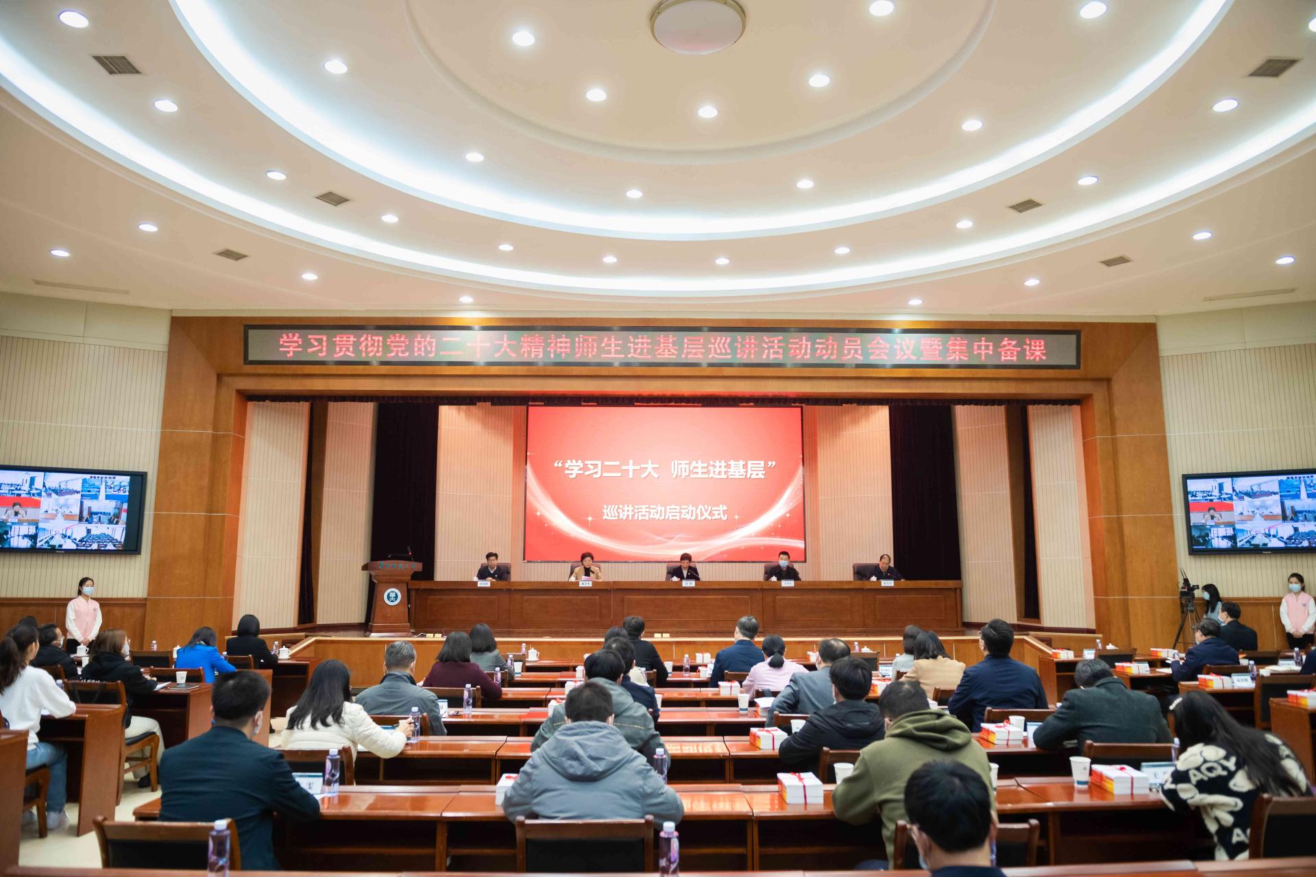 華大在線訊(記者 張嚴(yán)溢)11月23日,湖北省委教育工委、省教育廳在我校科學(xué)會堂舉行學(xué)習(xí)貫徹黨的二十大精神師生進(jìn)基層巡講活動動員會議暨集中備課,啟動“學(xué)習(xí)二十大,師生進(jìn)基層”巡講活動。會議以線上線下相結(jié)合的方式舉行,湖北省教育廳黨組書記、廳長周靜,湖北省委教育工委專職副書記、省教育廳黨組成員張幸平,湖北省委講師團(tuán)二級巡視員王中生,校黨委副書記、校長郝芳華,校黨委常委、副校長彭雙階出席。會議由張幸平主持。