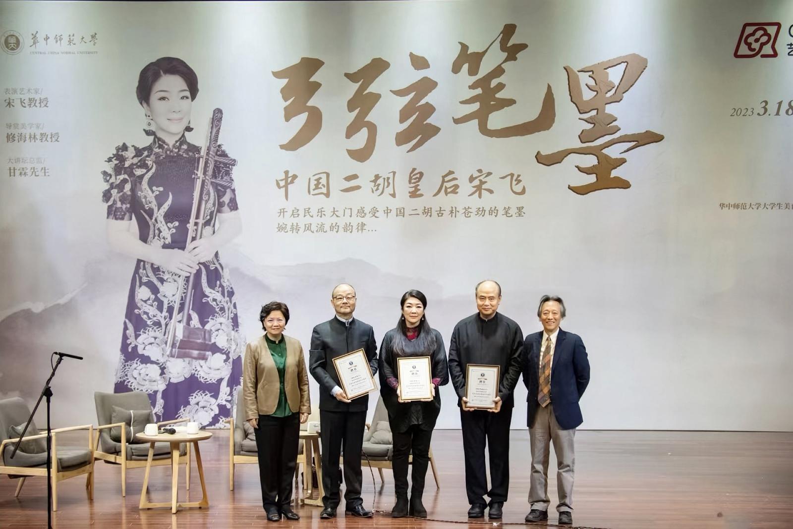 華大在線訊(記者 鄒媛奕 見習記者 李思彤)3月18日,我校第二屆“藝美大講壇”活動在音樂廳舉行。被譽為“中國二胡皇后”的著名二胡演奏家宋飛應邀擔任主講表演藝術(shù)家。中國音樂學院中國音樂史學研究中心主任修海林,著名作曲家、指揮家甘霖,校長郝芳華及大學生美育(藝術(shù))教育中心相關(guān)負責人出席本次活動。郝芳華為三位藝術(shù)家頒發(fā)大學生美育(藝術(shù))教育中心藝術(shù)咨詢委員會委員聘書。