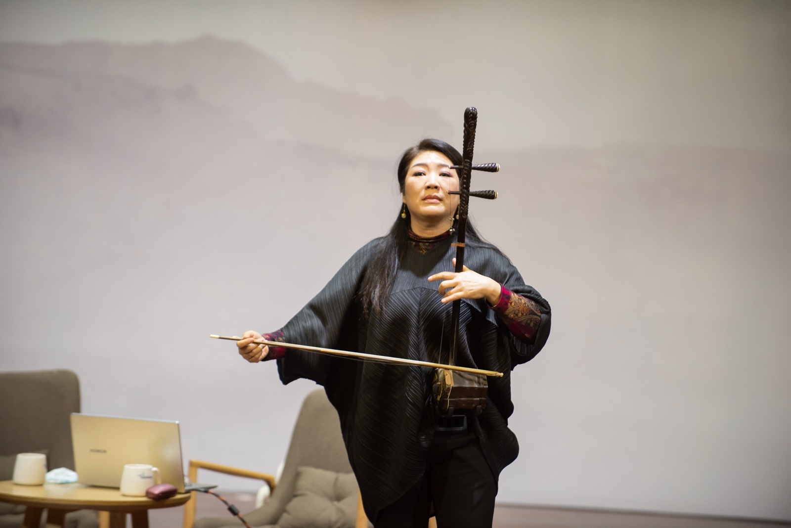 一首經(jīng)典的《空山鳥語》二胡演奏曲為現(xiàn)場師生帶來了聽覺上及心靈上的雙重享受,宋飛以純熟的技術(shù)和精湛的手法,將觀眾引入“空山不見人,但聞鳥語聲”的山水意境中?!澳锏难蹨I似水淌,點點灑在兒的心上……”婉轉(zhuǎn)凄哀的唱調(diào)與如泣如訴的二胡交相呼應,將一首感人至深的曲子《娘的眼淚》表現(xiàn)得淋漓盡致,也向觀眾展示了表演者如何深入把握樂曲中的細膩情感并將其融入演奏。