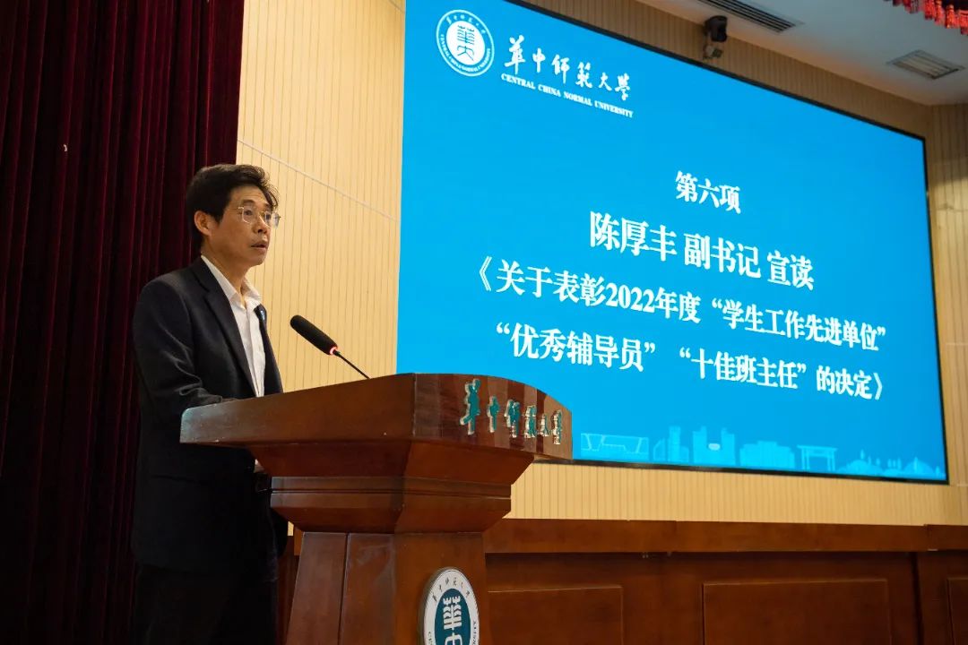 校黨委副書記、紀委書記陳厚豐宣讀《關于表彰2022年度“學生工作先進單位”“優秀輔導員”“十佳班主任”的決定》