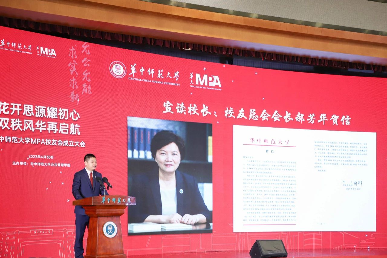 校友總會秘書長郭慶代表校友總會贈送紀念品,宣讀校長、校友總會會長郝芳華賀信。賀信中,郝芳華向MPA校友會的成立表示祝賀,希望MPA校友會精誠團結、積極作為,主動服務廣大校友事業發展;希望廣大校友牢記華師人肩負的歷史使命和時代擔當,在建設教育強國新征程中貢獻華師力量。