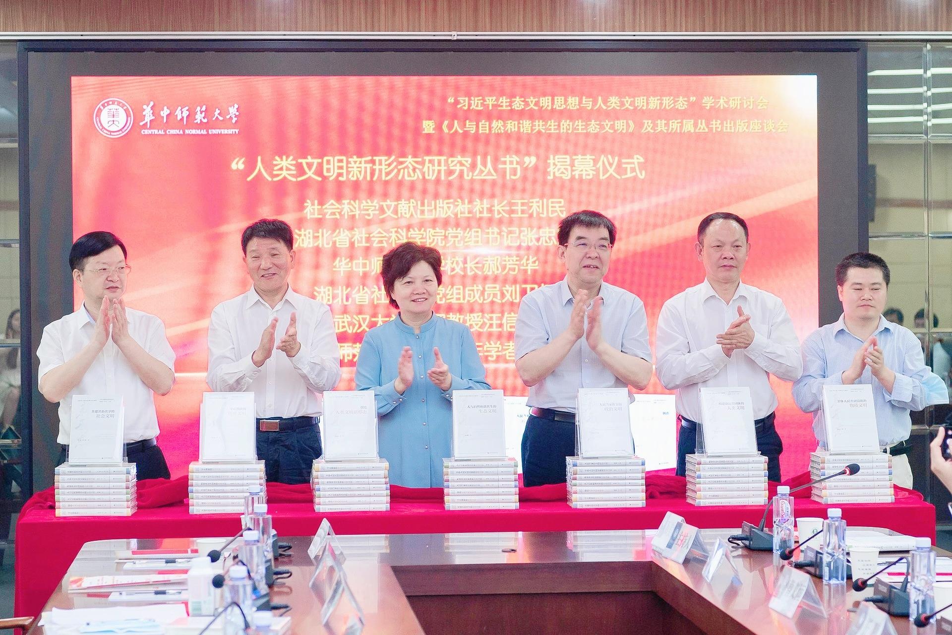 在“人類文明新形態研究叢書”揭幕儀式上,校長郝芳華、社會科學文獻出版社社長王利民、湖北省社會科學院黨組書記張忠家、湖北省社會科學界聯合會黨組成員劉衛橋、武漢大學資深教授汪信硯、我校桂子青年學者戴圣鵬等共同為新書揭幕。在學術研討階段,與會專家學者圍繞“習近平生態文明思想與人類文明新形態”主題,就習近平生態文明思想、人類文明新形態、中國式現代化與人類文明新形態、人類命運共同體與人類文明新形態、人類文明新形態與全球文明倡議、“人類文明新形態研究叢書”之出版價值等方面內容進行了深入探討。