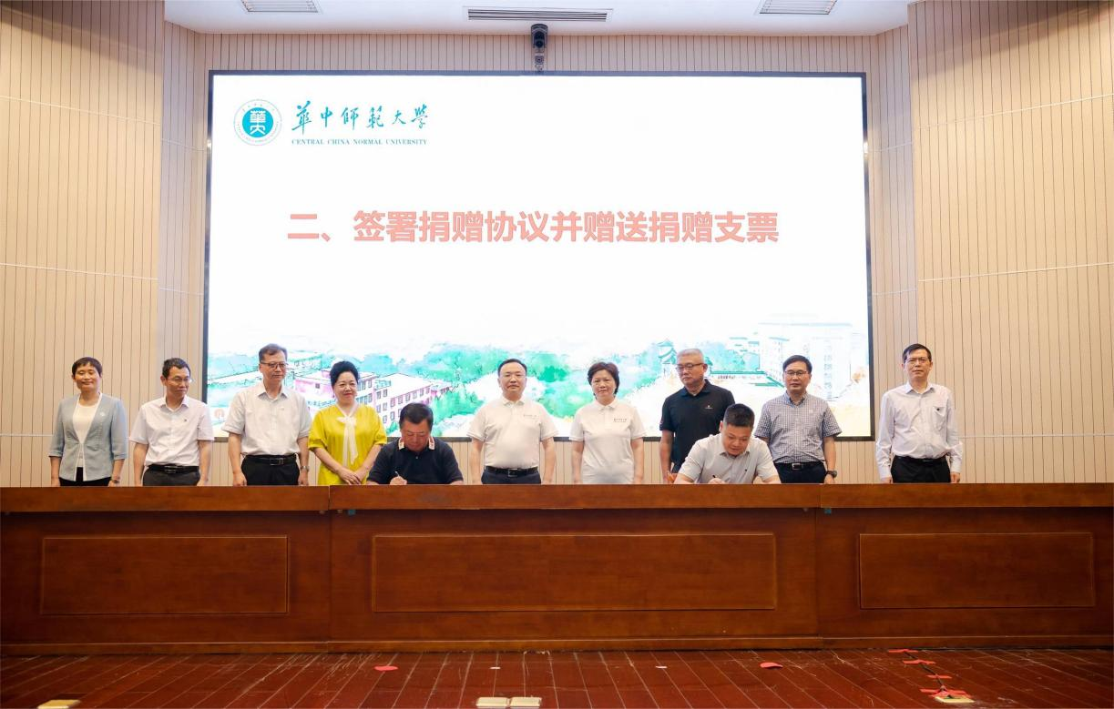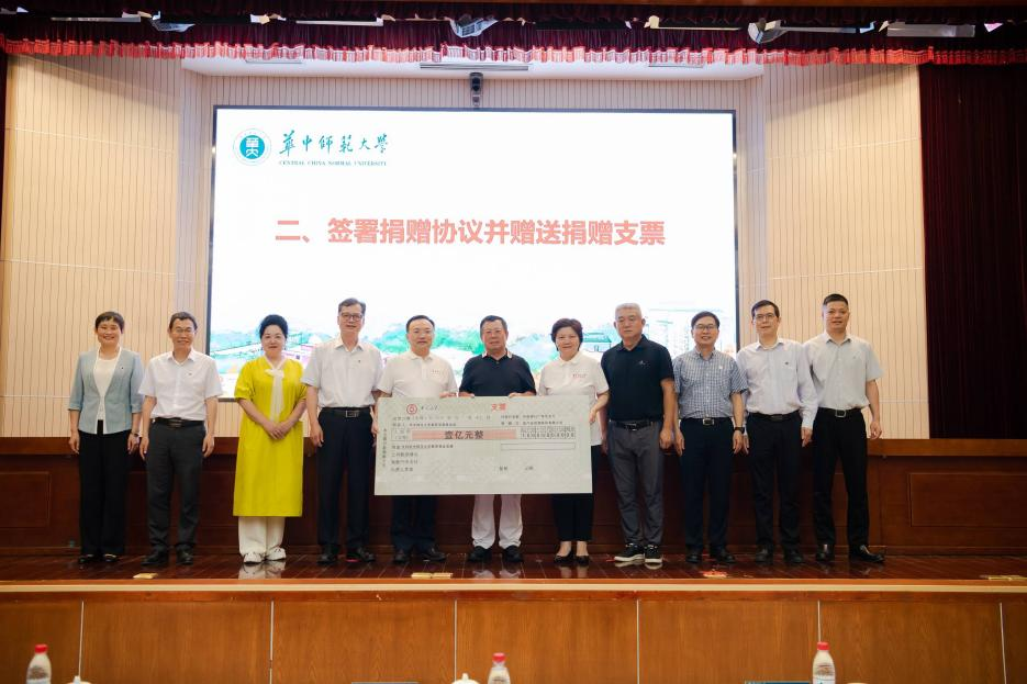 捐贈(zèng)儀式上,新產(chǎn)業(yè)投資股份有限公司向?qū)W校捐贈(zèng)1億元,用于支持我校人才引進(jìn)培養(yǎng)、學(xué)科建設(shè)發(fā)展、國(guó)際交流合作等領(lǐng)域的發(fā)展。夏立新為翁先定頒發(fā)華中師范大學(xué)教育發(fā)展“杰出貢獻(xiàn)獎(jiǎng)”。郝芳華為翁先定頒發(fā)捐贈(zèng)證書。