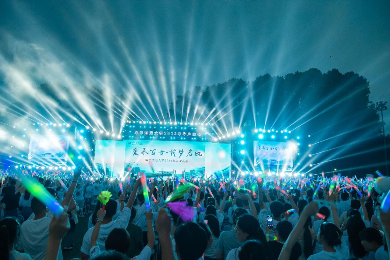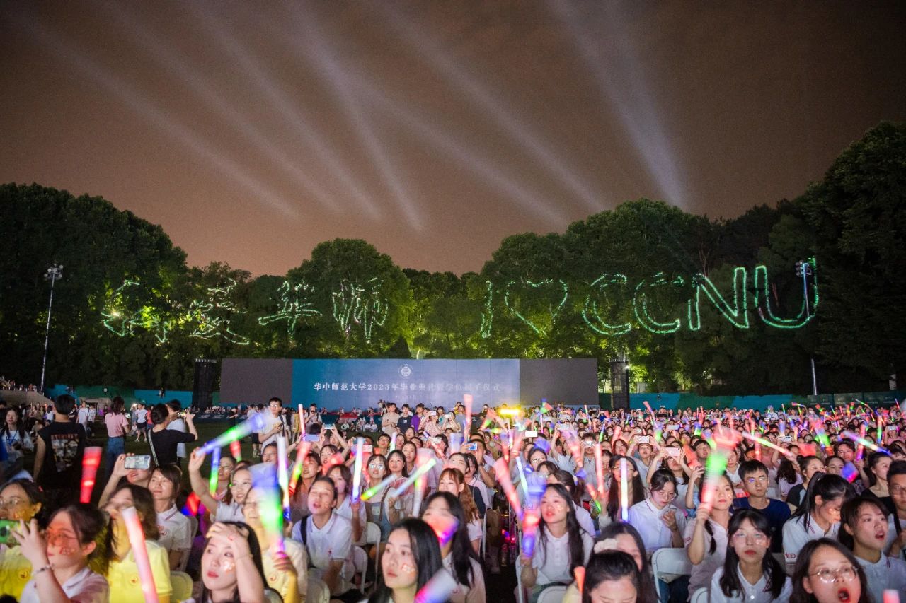畢業(yè)組歌中,《最初的夢想》帶領(lǐng)畢業(yè)生們重溫青蔥時光;《突然好想你》再次引起全場大合唱,粉色的舞臺燈光更顯離愁別緒;HANA樂隊的《再見,再見》將舞臺重新點燃,伴隨著“再見再見再見……”的歌聲,“我愛華師,I?CCNU”的投影出現(xiàn)在觀眾席背后,觀眾紛紛拍照留念。