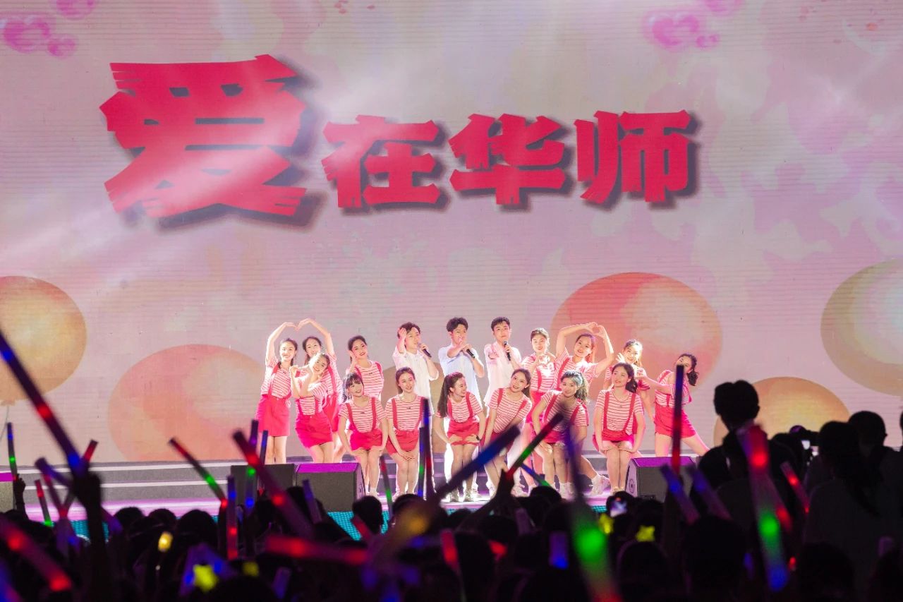 “寫一首品嘗橘子味晚霞的詩,寫一首佑銘燈光和人影閃爍的詩”,原創(chuàng)歌曲《寫一首華師》帶領(lǐng)觀眾徜徉于華師的各處景色,感受藏在時光深處里屬于華師的溫暖詩篇。歌曲表演《愛》同樣融合了華師元素,一句句歌詞都在訴說著對師長、對摯友、對華師的濃濃愛意。輕快動聽的旋律讓臺下觀眾自覺地隨著音樂節(jié)奏揮舞熒光棒,匯成翻涌的亮色海洋。