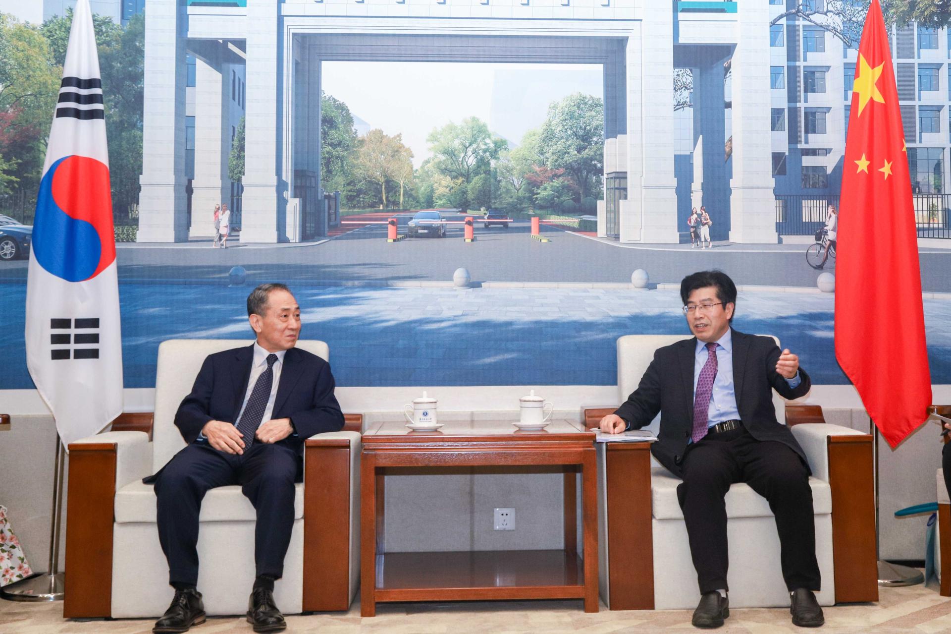 彭雙階對河成柱一行來訪表示熱烈歡迎。他向來賓介紹了學校辦學情況,并分享了學校在數字化和開放化方面的舉措和成效。他表示,學校不斷推進大數據、人工智能等信息技術與教育的深度融合,取得突出的成就,成為中國教育信息化領域的旗幟和標兵。我校是湖北省唯一一所具備本碩博多層次韓國語人才培養體系的高校,對韓國交流廣泛深入,希望在韓國駐武漢總領事館的支持下,進一步拓展對韓交流,與更多韓國高校開展更加深入合作,為增進中韓兩國教育文化交流做出更大貢獻。