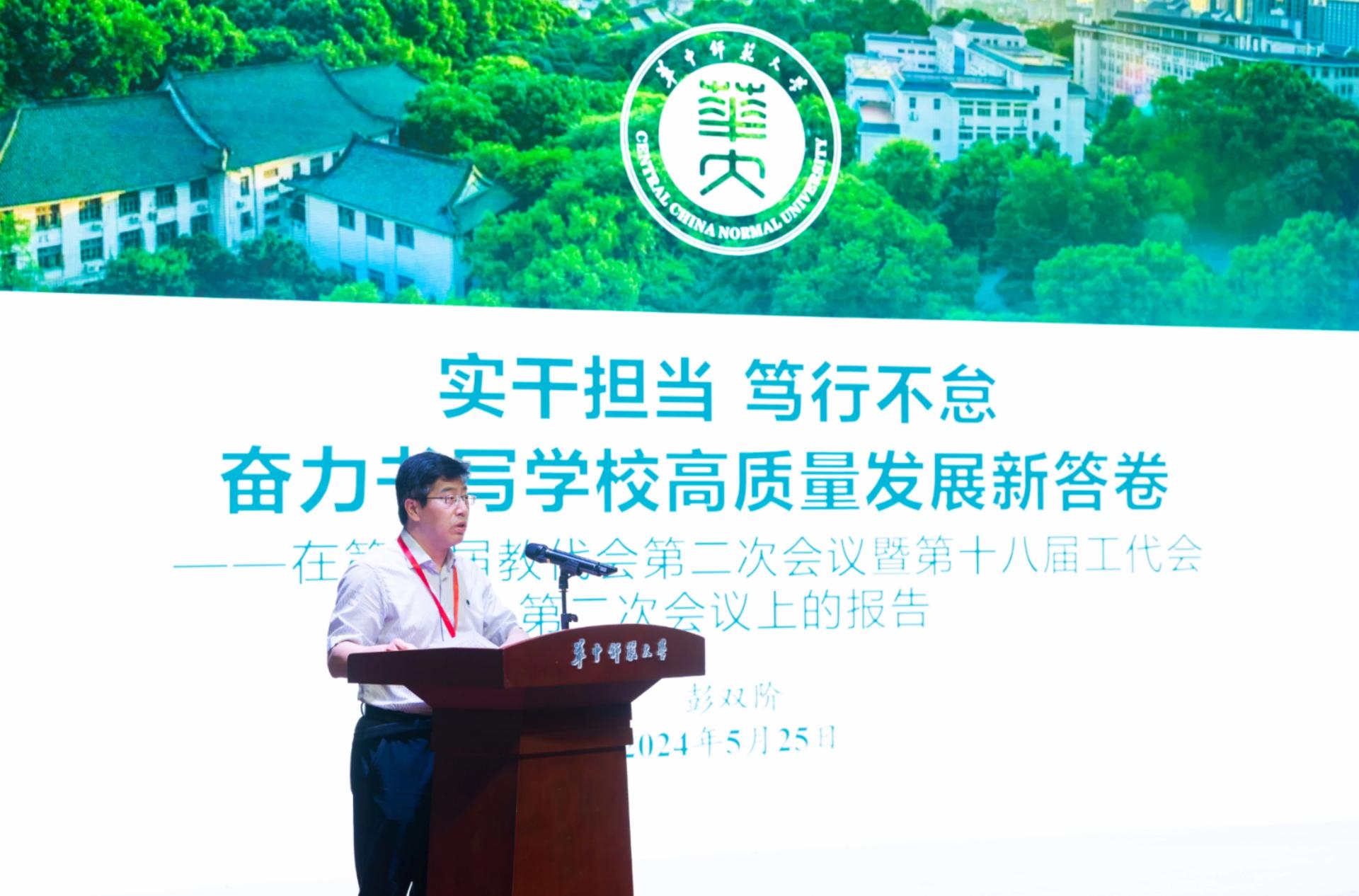 校長彭雙階代表學校向大會作了題為“實干擔當 篤行不怠奮力書寫學校高質量發展新答卷”的工作報告,全面回顧了學校2023年各項工作。彭雙階表示,2023年,在教育部黨組和湖北省委的正確領導下,全校上下以習近平新時代中國特色社會主義思想為指導,深入學習貫徹黨的二十大精神,全面落實習近平總書記關于教育的重要論述,積極投身教育強國實踐,學校各項事業實現長足發展:黨的建設持續加強,人才培養成績斐然,科學研究成果豐碩,學科建設加快推進,人才隊伍建設成效顯著,開放辦學格局一新,條件保障穩步優化,校慶活動隆重熱烈。這些成績和進步離不開全體師生的辛勤付出和團結奮斗。