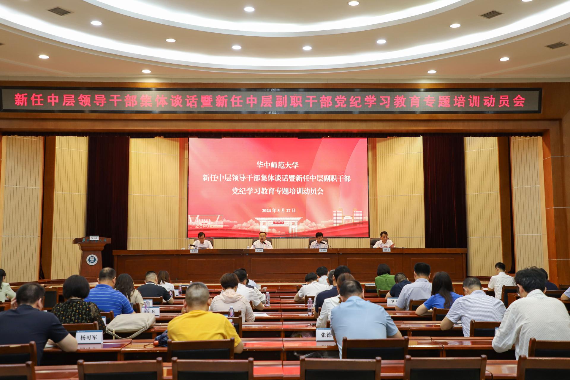 華大在線訊(通訊員 張栩晨)5月27日,學校新任中層領導干部集體談話暨新任中層副職干部黨紀學習教育專題培訓動員會在科學會堂一樓報告廳舉行。校黨委書記夏立新,校長彭雙階,校黨委副書記陳迪明,校黨委副書記、紀委書記劉繼文出席并講話,相關單位新提任中層干部參會。會議由陳迪明主持。