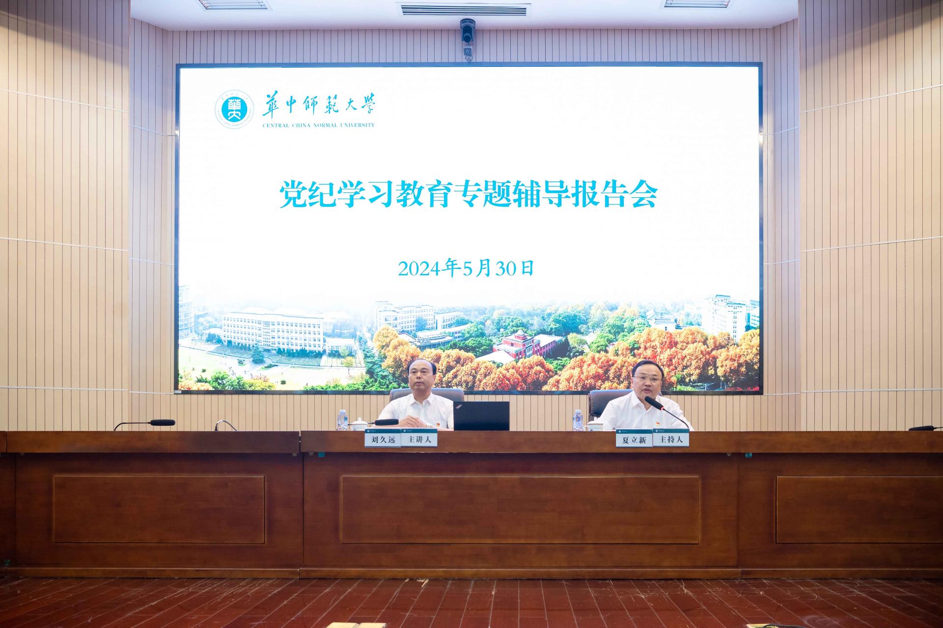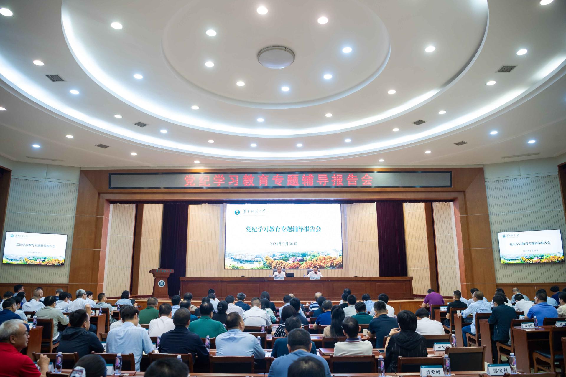華大在線訊(通訊員 王濤)為深入學(xué)習(xí)貫徹《中國共產(chǎn)黨紀(jì)律處分條例》(以下簡稱《條例》),進(jìn)一步加強(qiáng)全校黨員干部的黨性教育和紀(jì)律建設(shè),推動黨紀(jì)學(xué)習(xí)教育走深走實,5月30日,學(xué)校黨委舉行黨紀(jì)學(xué)習(xí)教育專題輔導(dǎo)報告會,師生黨員“同上一堂黨紀(jì)課”。湖北省監(jiān)察委員會委員劉久遠(yuǎn)應(yīng)邀作專題輔導(dǎo)報告。校黨委書記夏立新主持報告會。