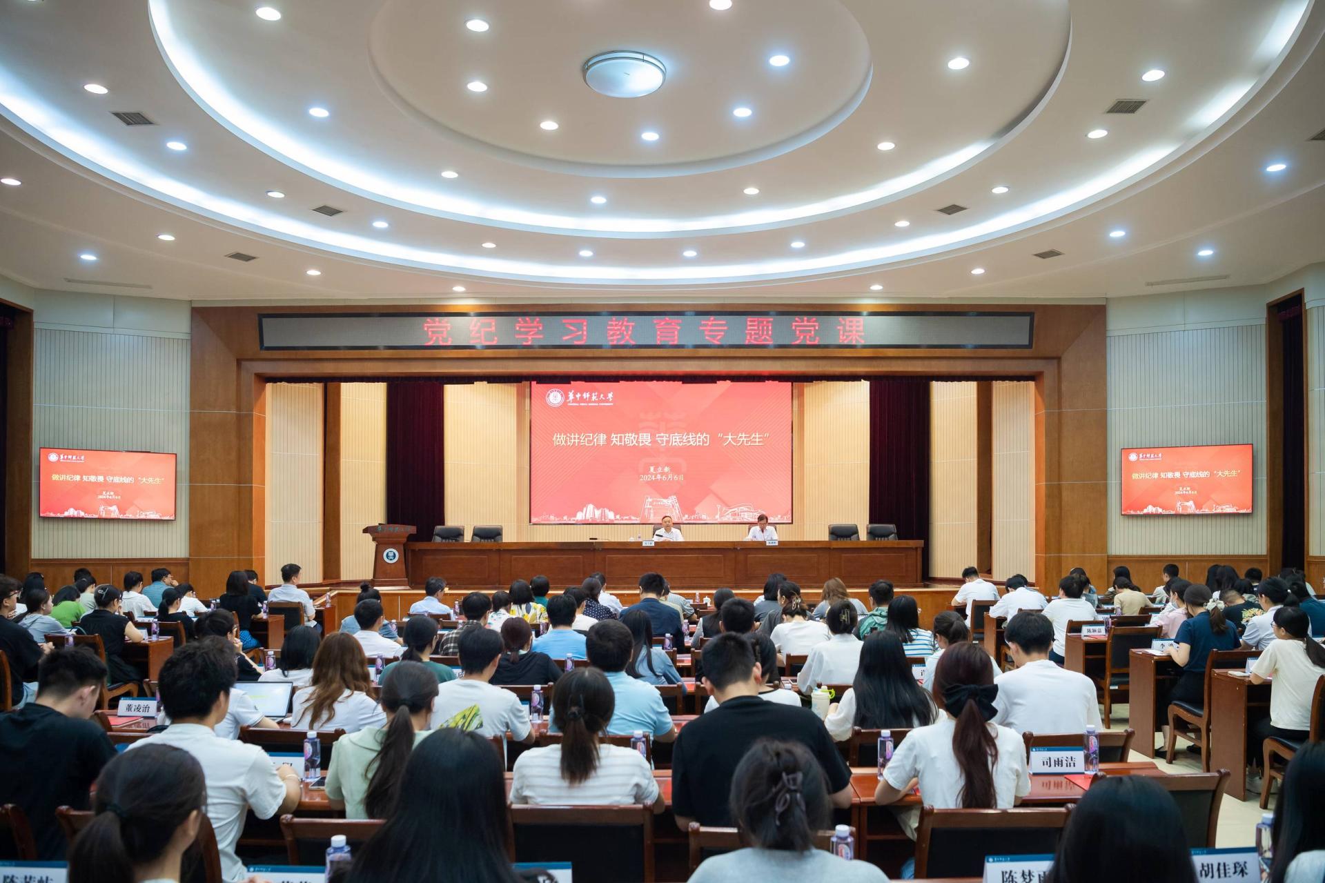華大在線訊(記者 黃妍妍 實習記者 羅欣恬)為深入學習貫徹《中國共產黨紀律處分條例》,推動黨紀學習教育走深走實,6月6日,校黨委書記夏立新在科學會堂一樓報告廳,以《做講紀律、知敬畏、守底線的“大先生”》為題,為我校師生黨員講授專題黨課并進行警示教育。財務處黨支部全體在職黨員,馬克思主義學院和物理科學與技術學院班子成員及教工黨支部書記,教師代表及畢業生黨員代表等參加。專題黨課由校黨委副書記陳迪明主持。