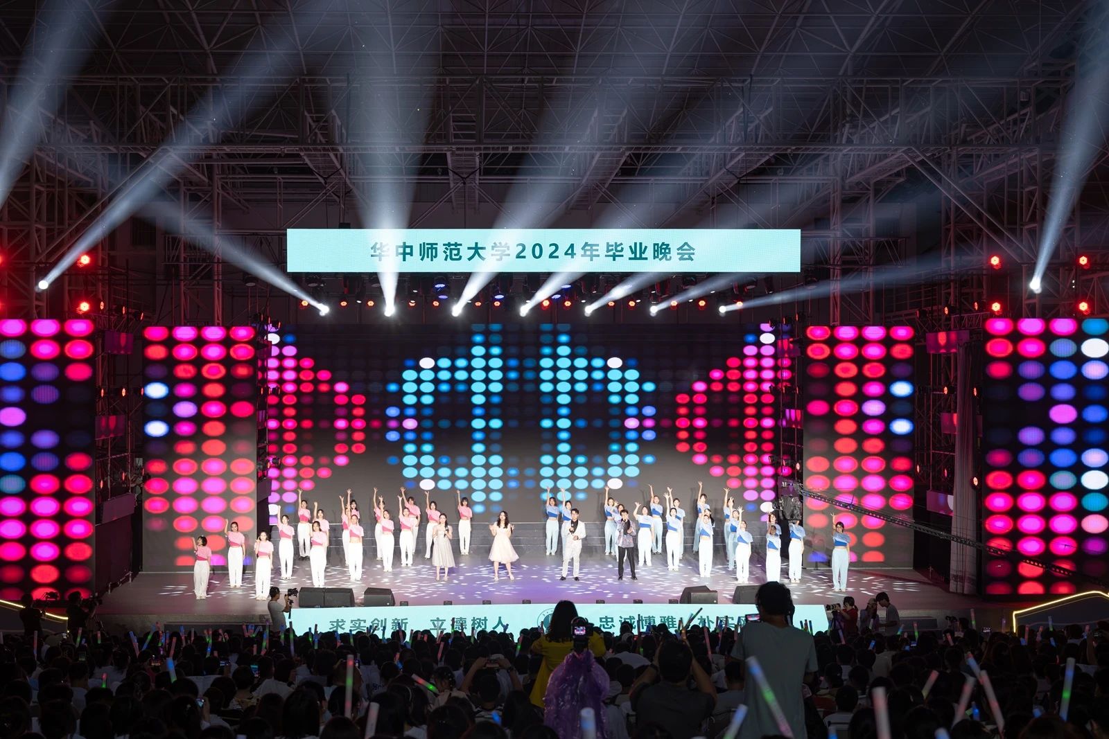 華師將一屆又一屆的學子送上人生的征程,激勵他們勇往直前。當“常回家看看”“畢業快樂”的投影出現時,當每一位畢業生的名字在大屏幕上浮現時,同學們紛紛拍照留念,熱情合唱。晚會在《再見》的歌聲中落幕,在這花開似錦、綠柳成蔭的六月,畢業生們和過去揮手暫別,準備開啟奮力書寫“強國建設,華師有為”的青春篇章。