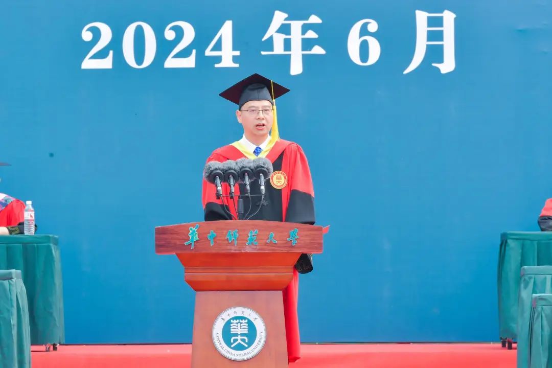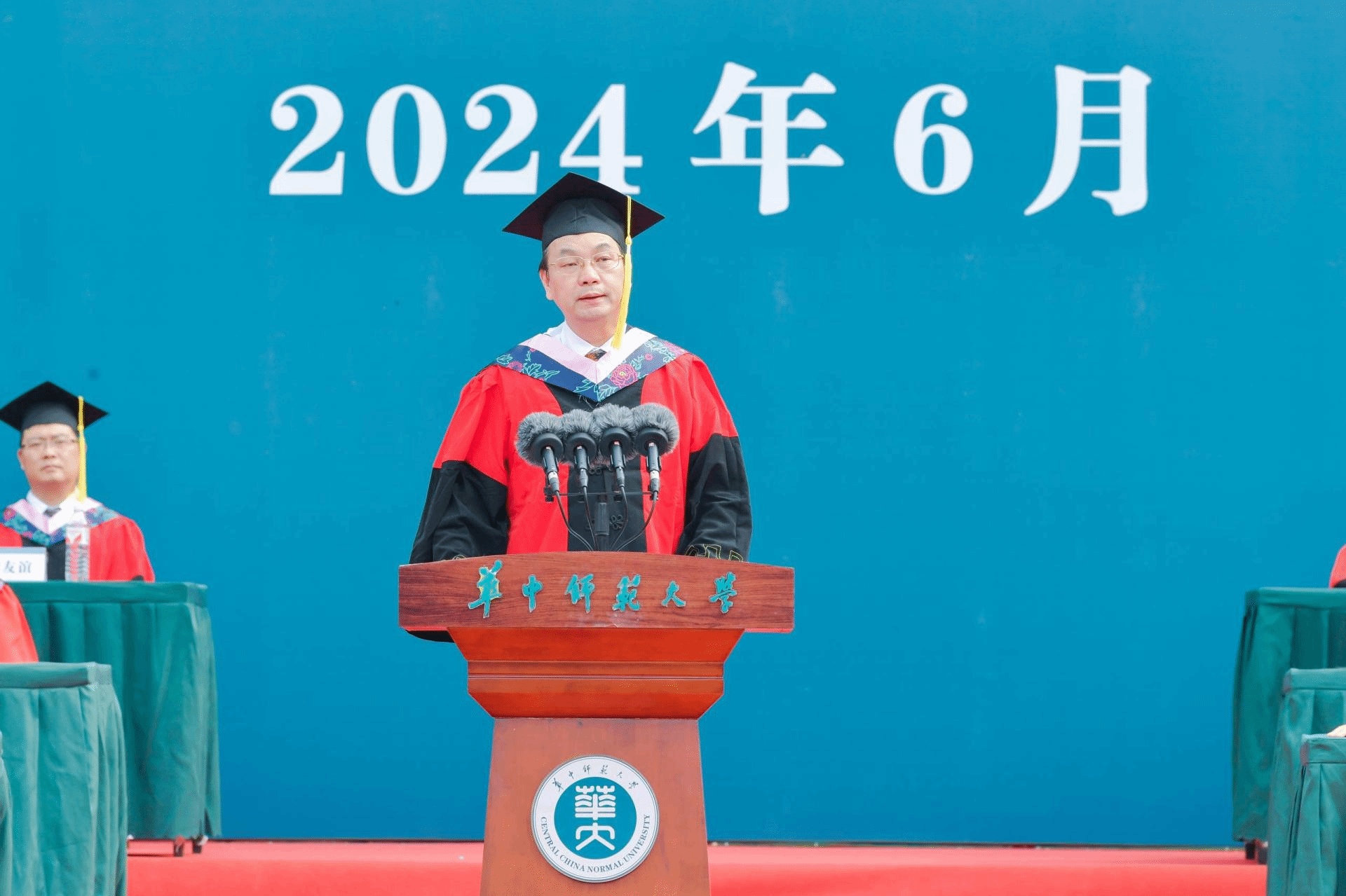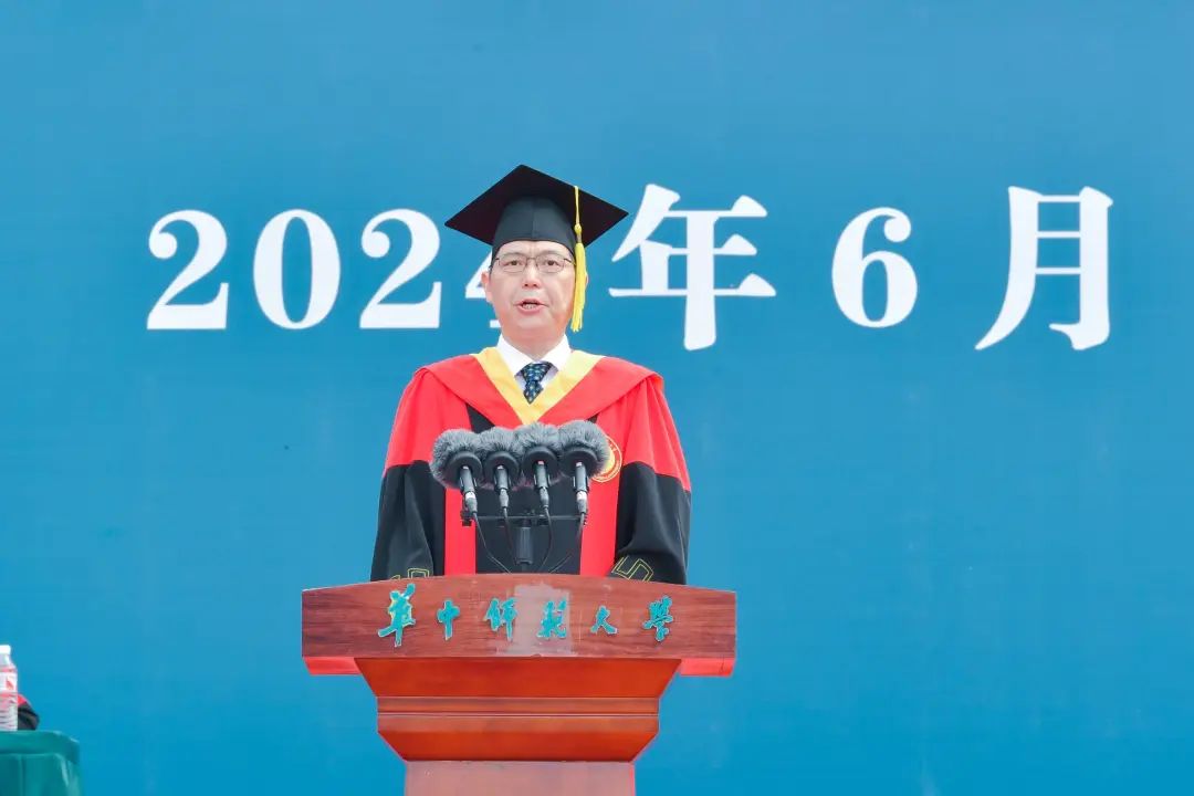 彭雙階向圓滿完成學業的畢業生們表示熱烈祝賀,向潛心育人的老師們和默默付出的家長們致以衷心感謝。彭雙階回顧了同學們在桂子山上的求學時光,“從被錄取的那一刻起,你們就和學校風雨同舟、休戚與共。大家一起見證了華師120周年校慶,共同開啟了學校建設教師教育領先的世界一流大學新征程。更美好的華師,與更優秀的你們相遇相知、共同成長”。