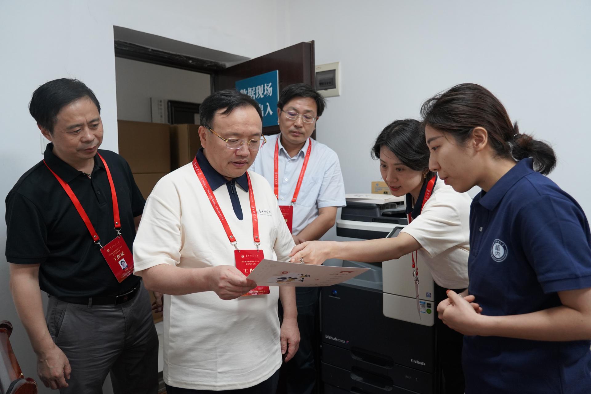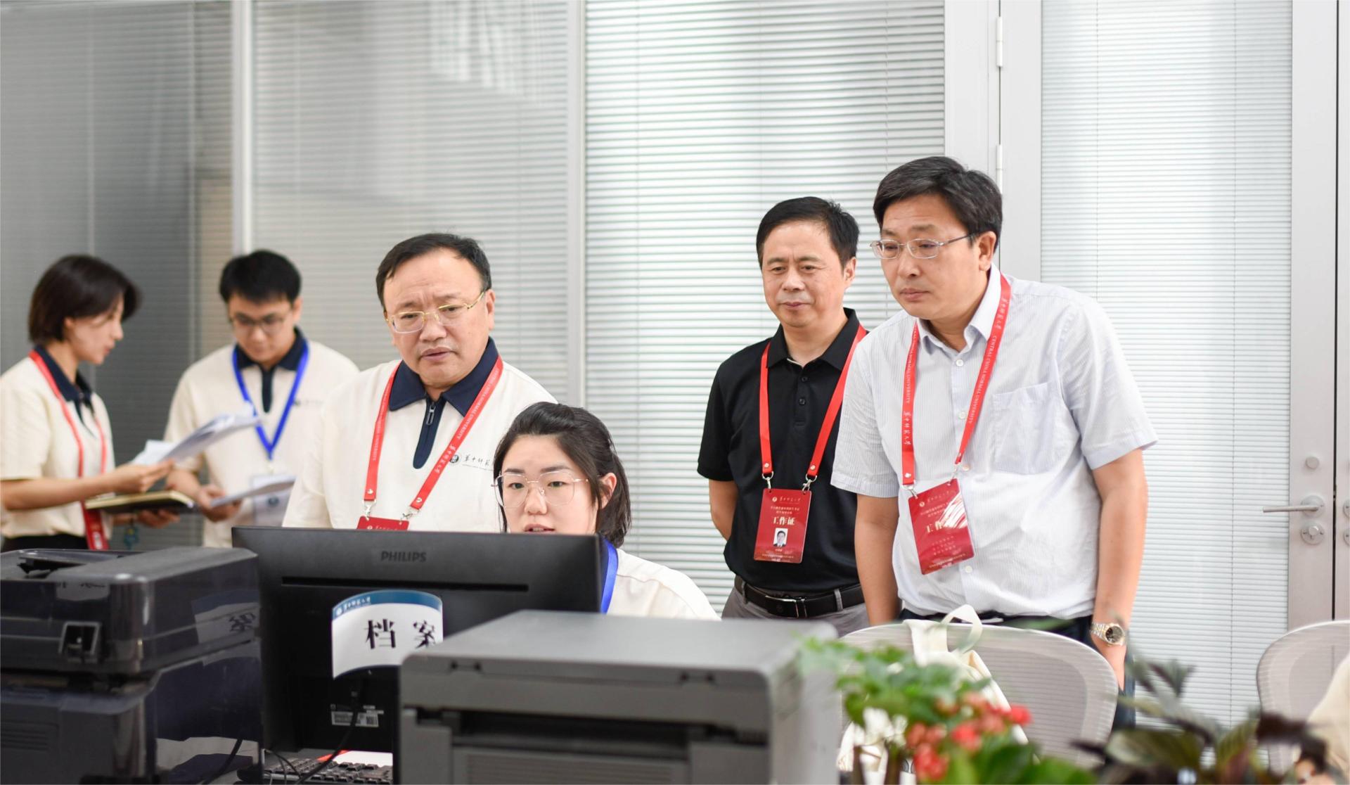 在本科招生錄取現場,“陽光招生,科學選才”的標語突出醒目,教育部高校招生“十嚴禁”“30個不得”“八項基本要求”等規定懸掛于墻,清晰顯眼。20余名工作人員分別堅守在招生咨詢、系統錄檢、資格審查、數據處理等崗位,分工明確,流程緊湊,各項工作井然有序。夏立新一行與現場工作人員親切交流,詳細了解招生錄取的工作流程,并就相關注意事項進行了交流。通過招生錄取可視化數據大屏,本科生院相關負責人向校領導匯報了我校招生錄取進度和生源質量等情況,重點介紹了首次招生的本研銜接公費師范生的招生錄取等相關情況。