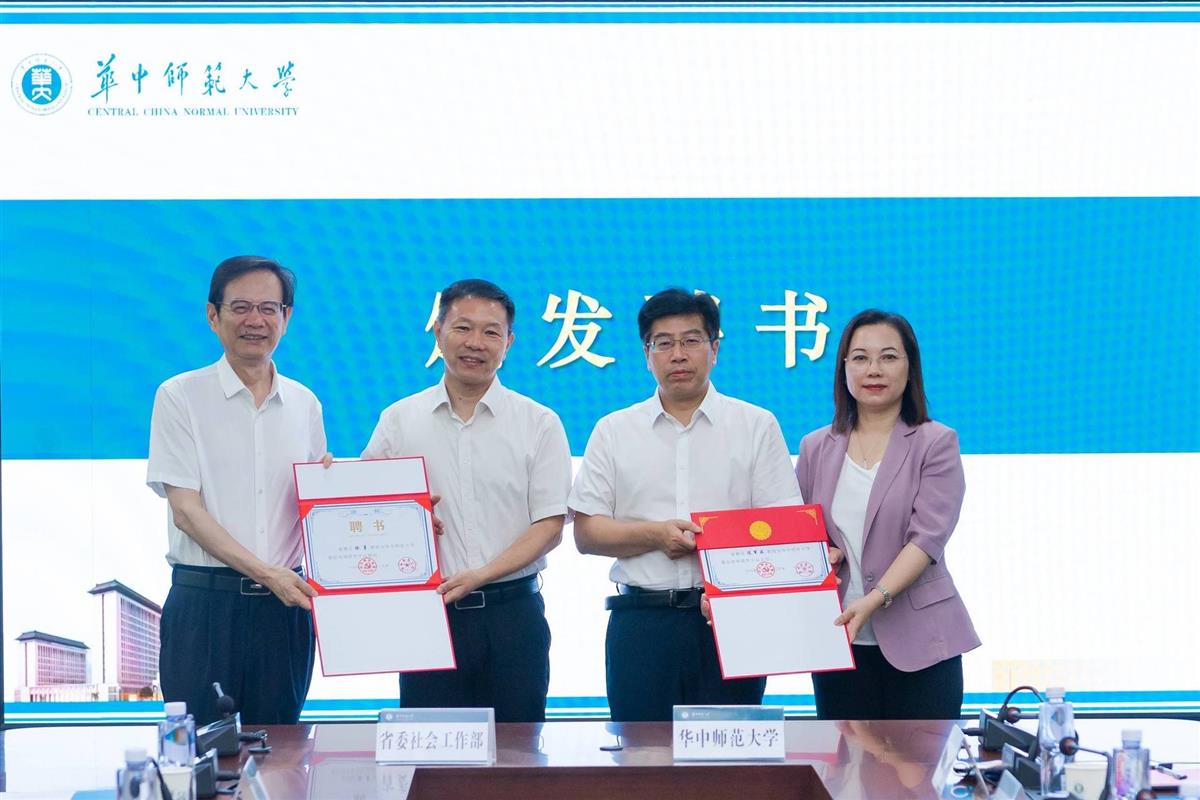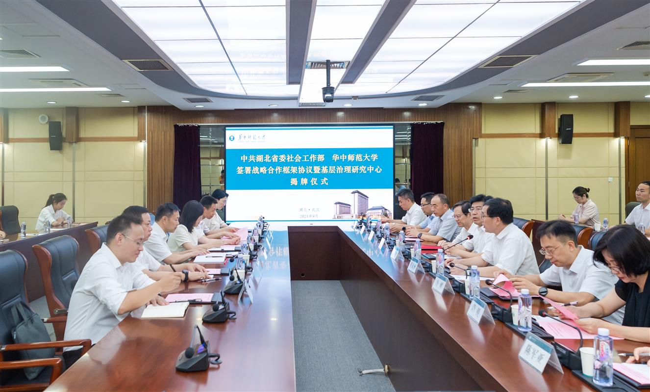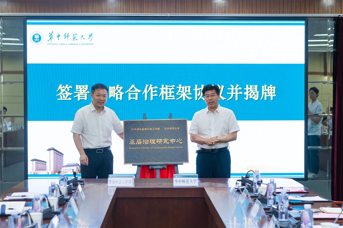 華大在線訊(通訊員 凌潔)8月4日,中共湖北省委社會(huì)工作部與我校簽署戰(zhàn)略合作框架協(xié)議。簽約儀式上,省委社會(huì)工作部部長、兩新工委書記蔣星華和校長彭雙階共同為“華中師范大學(xué)基層治理研究中心”揭牌。省委社會(huì)工作部二級(jí)巡視員朱紅,副校長任友洲,我校政治學(xué)部部長、人文社科資深教授徐勇出席儀式。