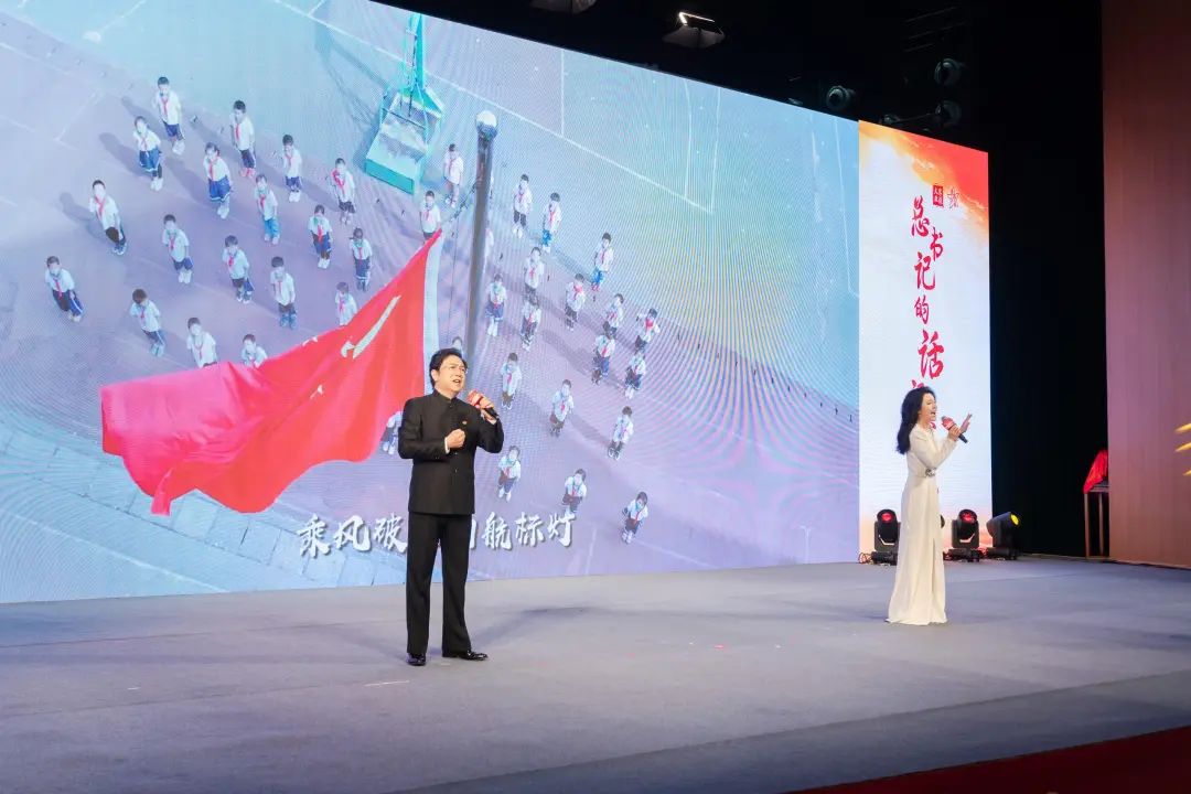 “五星紅旗你是我的驕傲,五星紅旗我為你自豪……”全體師生揮動手中的國旗,與華中師范大學大學生藝術團齊聲高唱《紅旗飄飄》,歌聲激昂,振奮人心。一曲《歌唱祖國》讓現(xiàn)場氛圍更加熱烈,師生們起立合唱,深深愛國情,油然而生。