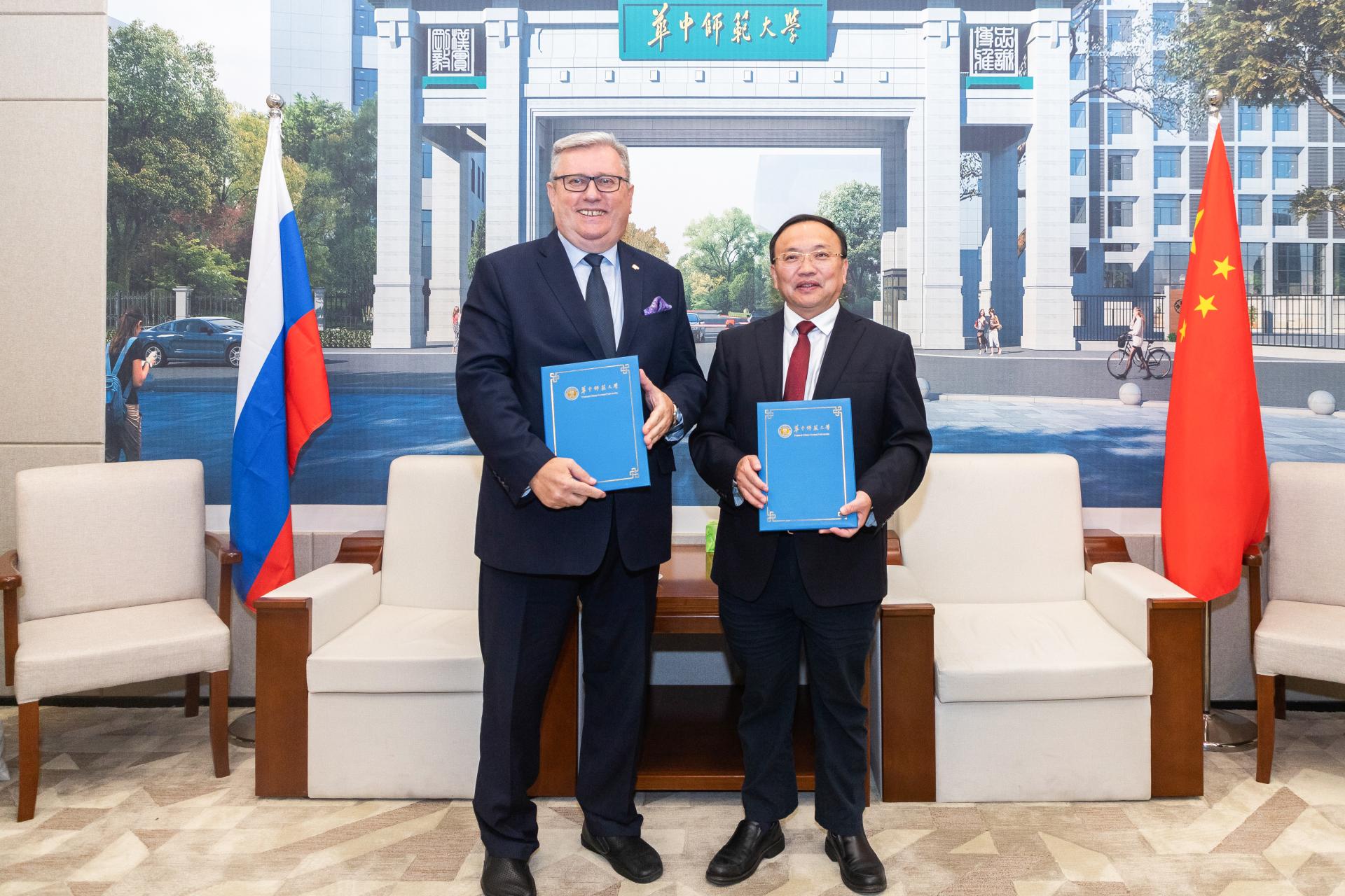 華大在線訊(通訊員 張芷珣)10月10日,校黨委書記夏立新、副校長任友洲在校史館一樓貴賓廳會(huì)見俄羅斯教育科學(xué)院院士、莫斯科國立師范大學(xué)(簡稱“莫師大”)校長盧布科夫一行。國際合作與交流處、國際文化交流學(xué)院相關(guān)負(fù)責(zé)人參加會(huì)見。