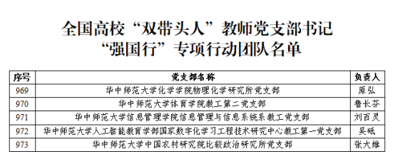 華大在線訊(通訊員 李杰)近日,教育部辦公廳公布了全國高?!半p帶頭人”教師黨支部書記“強國行”專項行動團隊(以下簡稱“強國行”專項行動)名單,我校5個黨支部入選。