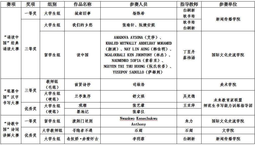 據(jù)悉,“詩教中國(guó)”詩詞講解大賽留學(xué)生組一等獎(jiǎng),湖北省僅我校一所高校入選,“誦讀中國(guó)”經(jīng)典誦讀大賽大學(xué)生組一等獎(jiǎng),湖北省僅有兩所高校(含我校)入選。前期,該項(xiàng)比賽湖北賽區(qū)競(jìng)賽我校共計(jì)獲獎(jiǎng)27項(xiàng)。