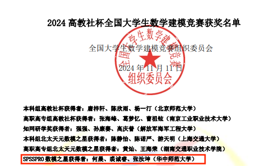 此次競賽中,我校參賽師生奮力拼搏、一路過關斬將,有兩支隊伍進入全國最終面試答辯(全國本科生組總共7支隊),最終雙雙斬獲國家一等獎,其中一支隊伍榮獲今年首次設立的冠名獎“SPSSPRO數模之星”。