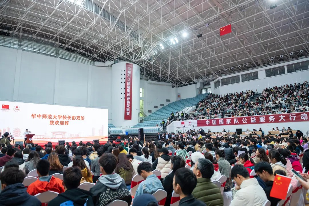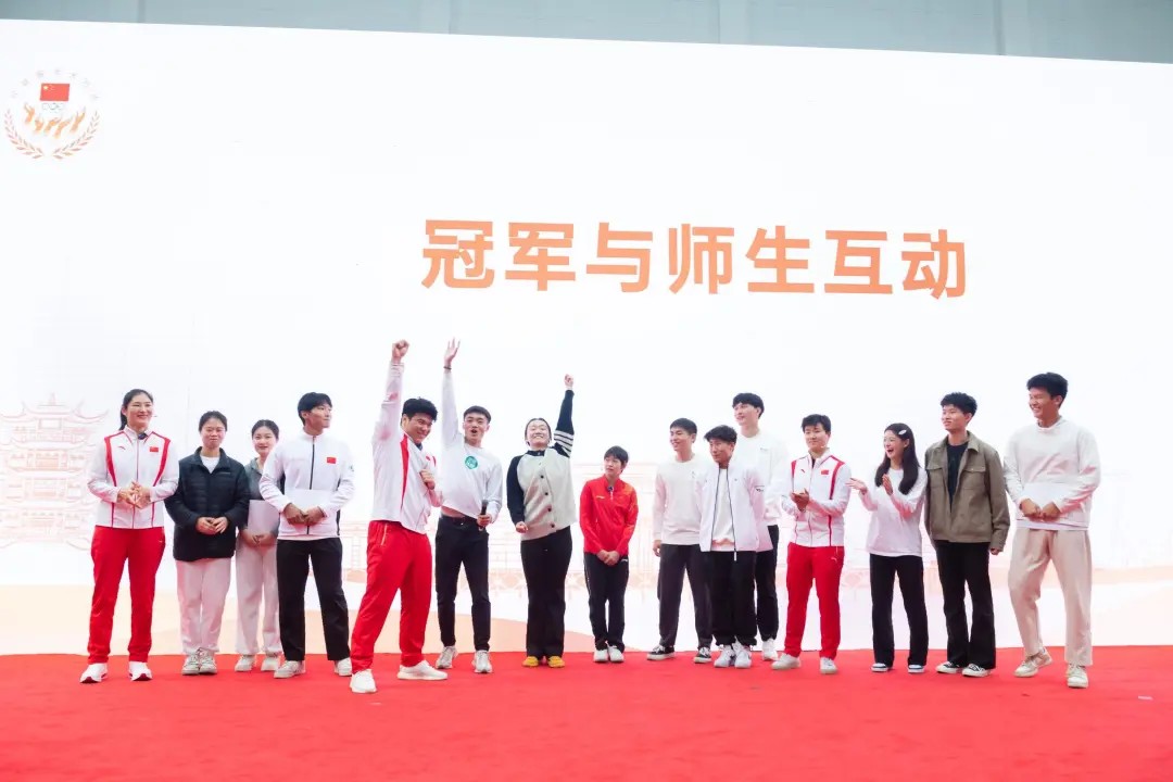 于建勇在講話中談到,自從2011年來,中國國家隊公益服務大行動已累計在全國舉辦了上百場,邀請了數百位優秀運動員深入基層普及運動項目的知識,傳遞榜樣的力量。每一位冠軍運動員的榮耀背后都是無數次汗水與淚水的交織,是勇于挑戰極限精神的生動詮釋。希望通過本次活動,將奧運精神傳遞給每一位在座的同學,期待大家以奧運冠軍為榜樣,樹立崇高理想,磨礪堅韌品質,勇敢追逐夢想。