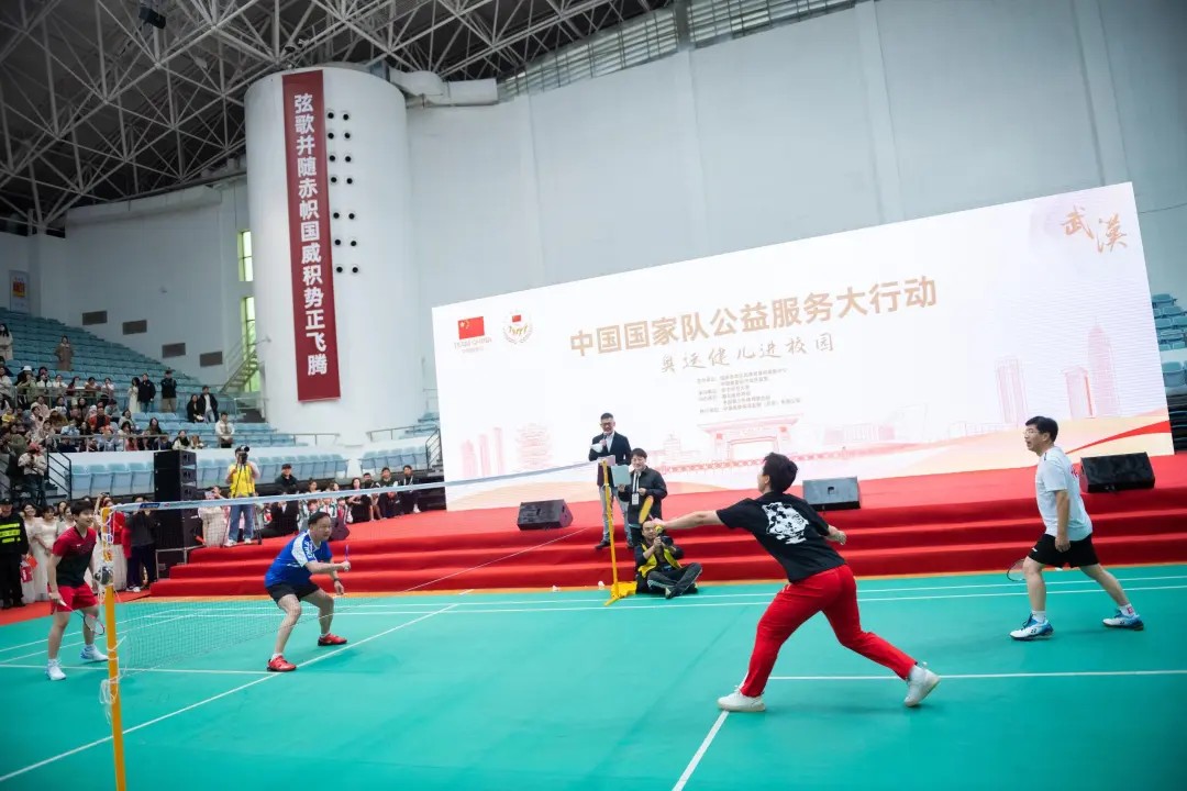 羽毛球表演賽中,對戰雙方你來我往,配合默契