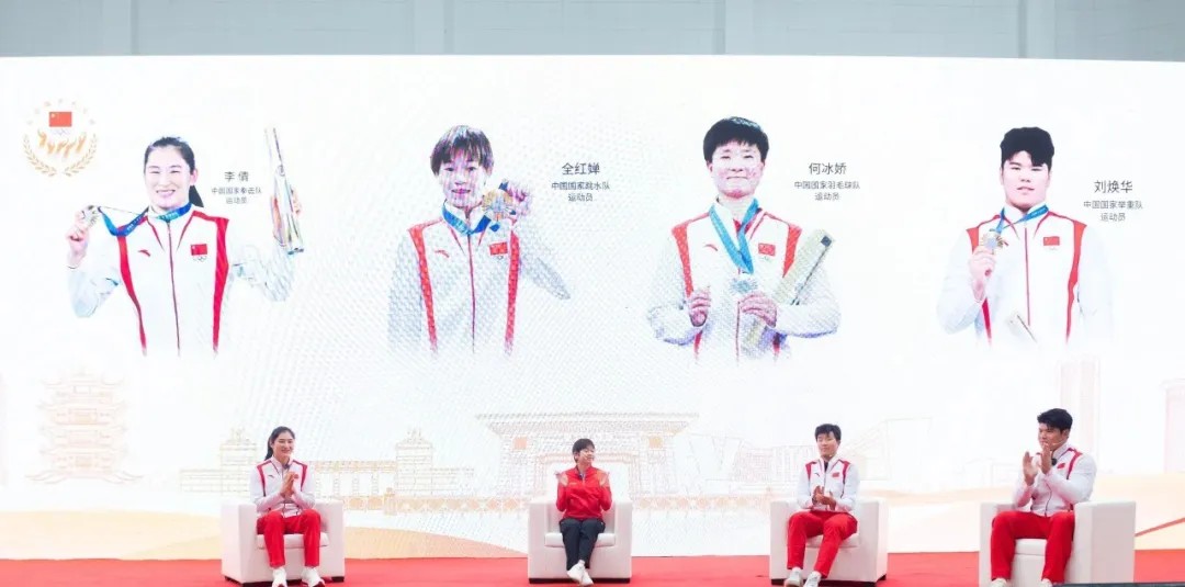 冠軍訪談環節,四位奧運健兒向師生們分享了各自的成長故事,以及運動生涯中歷經的榮耀和艱辛。三次征戰奧運會,終于在巴黎奧運會上摘金圓夢,李倩說,希望將來的自己能成為教練員,為國家培養出更多的奧運冠軍。從初登跳臺“不敢往下看”到練就令人驚羨的“水花消失術”的奧運冠軍,全紅嬋的秘訣是“不斷練習,形成肌肉記憶。”質樸的語言和率真的分享贏得全場師生陣陣掌聲。何冰嬌坦言在自己的運動生涯中經歷過大大小小的低谷期,“我相信只要堅持不放棄,就一定會走過去。跨過‘瓶頸’之后就會發現,技術水平就會迎來很大的提升。”劉煥華回顧了自己三年里跨越5個級別參賽的經歷,尤其是備賽亞運會和奧運會期間,他直面體重挑戰,毫不松懈地加緊訓練,讓觀眾看到了運動員在榮譽背后付出的汗水和努力。