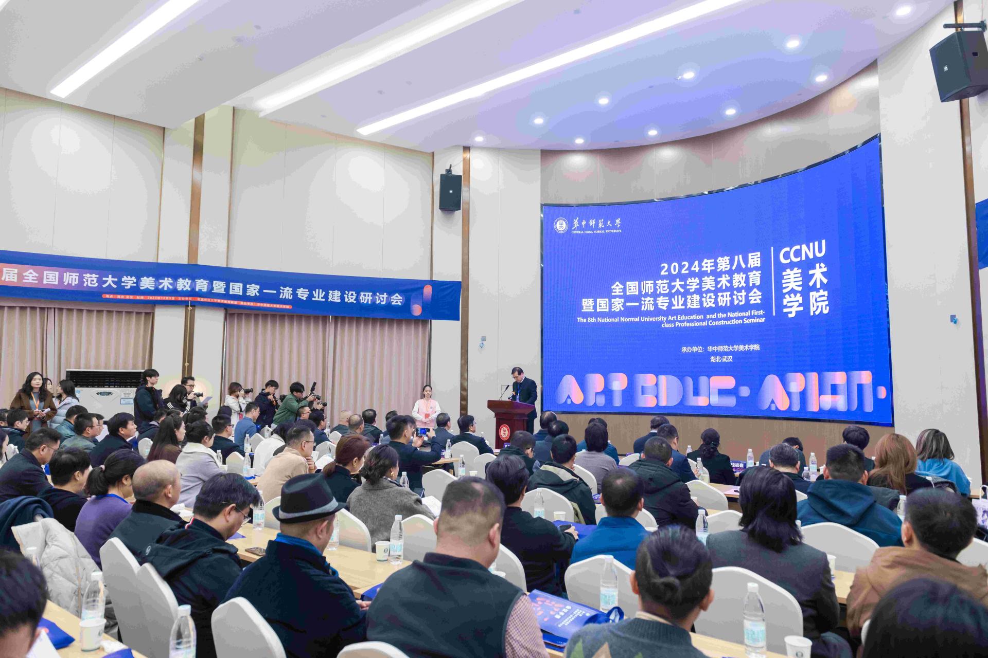 華大在線訊(通訊員 蘇珊 張曉冰)12月4日至6日,由全國(guó)師范大學(xué)美術(shù)教育聯(lián)盟主辦、我校美術(shù)學(xué)院承辦的第八屆全國(guó)師范大學(xué)美術(shù)教育暨國(guó)家一流專業(yè)建設(shè)研討會(huì)在校召開。來(lái)自全國(guó)40余所師范院校的120余名專家學(xué)者相聚桂子山,共同探討師范院校美術(shù)教育的新理念與新方向,為促進(jìn)美術(shù)教育人才培養(yǎng)模式的改革與創(chuàng)新匯聚各方智慧。校長(zhǎng)彭雙階,湖北省文聯(lián)副主席、湖北美術(shù)學(xué)院院長(zhǎng)周峰,湖北省教育廳體育衛(wèi)生與藝術(shù)教育處處長(zhǎng)丁雪峰出席開幕式并致辭。開幕式由校黨委副書記陳迪明主持。