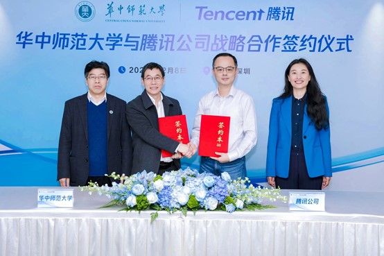 彭雙階對深圳市騰訊計算機系統(tǒng)有限公司(以下簡稱“騰訊公司”)長期以來對我校創(chuàng)新平臺建設(shè)、創(chuàng)新人才培養(yǎng)與交流、智慧校園建設(shè)的大力支持表示感謝。他表示,騰訊公司作為互聯(lián)網(wǎng)科技領(lǐng)軍企業(yè),以卓越的創(chuàng)新精神和深厚的技術(shù)實力,持續(xù)引領(lǐng)全球科技行業(yè)的發(fā)展潮流。華中師范大學(xué)將發(fā)揮學(xué)科優(yōu)勢、人才優(yōu)勢,結(jié)合騰訊技術(shù)力量和行業(yè)資源優(yōu)勢,全面推進教育數(shù)字化轉(zhuǎn)型為戰(zhàn)略目標(biāo),全面賦能高等教育創(chuàng)新發(fā)展。