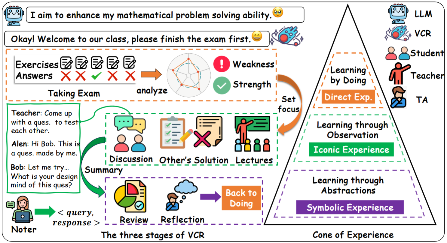 研究成果“VCR: A ‘Cone of Experience’ Driven Synthetic Data Generation Framework for Mathematical Reasoning”被人工智能?chē)?guó)際頂級(jí)會(huì)議AAAI《The 39th Annual AAAI Conference on Artificial Intelligence》正式接收錄用。大語(yǔ)言模型在自然語(yǔ)言處理方面性能出色,但面對(duì)數(shù)學(xué)推理往往存在較大挑戰(zhàn)。隨著訓(xùn)練模式的逐漸固化,學(xué)術(shù)界提出以數(shù)據(jù)為中心的人工智能思想,強(qiáng)調(diào)開(kāi)發(fā)更高質(zhì)量的數(shù)據(jù)以增強(qiáng)大語(yǔ)言模型性能?,F(xiàn)有研究擴(kuò)展數(shù)據(jù)集構(gòu)建面向數(shù)學(xué)推理的合成數(shù)據(jù),進(jìn)而監(jiān)督微調(diào)大語(yǔ)言模型。這類方法大多關(guān)注數(shù)量而忽視質(zhì)量,具有挑戰(zhàn)性的樣本在數(shù)據(jù)合成過(guò)程中沒(méi)有得到充分的考慮,導(dǎo)致數(shù)據(jù)構(gòu)建成本高、密度低、同質(zhì)化嚴(yán)重。該成果提出了一種名為Virtual ClassRoom(VCR)的多智能體環(huán)境,利用大語(yǔ)言模型驅(qū)動(dòng)多種智能體角色構(gòu)建高質(zhì)量、多元化的合成數(shù)據(jù)。基于“經(jīng)驗(yàn)之塔”理論,VCR類比人類學(xué)習(xí),在數(shù)據(jù)合成過(guò)程中引入三個(gè)層次的經(jīng)驗(yàn),精心設(shè)計(jì)了用戶友好的指令集和角色扮演系統(tǒng),使VCR能夠自主規(guī)劃合成數(shù)據(jù)的規(guī)模。該系統(tǒng)實(shí)現(xiàn)了包括講授、研討、問(wèn)題設(shè)計(jì)、問(wèn)題解決等多種教育場(chǎng)景的自主模擬。多個(gè)實(shí)驗(yàn)表明VCR生成的合成數(shù)據(jù)具有更高的質(zhì)量密度和泛化能力,能夠以較小的訓(xùn)練代價(jià)提高大語(yǔ)言模型的數(shù)學(xué)推理性能。
