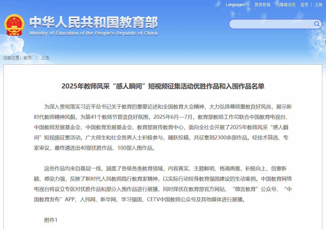本次教師風(fēng)采“感人瞬間”短視頻征集活動(dòng)由教育部教師工作司聯(lián)合中國(guó)教育電視臺(tái)、中國(guó)教師發(fā)展基金會(huì)等多部門共同舉辦,旨在為第41個(gè)教師節(jié)營(yíng)造良好氛圍,展現(xiàn)新時(shí)代教師隊(duì)伍精神風(fēng)貌。活動(dòng)共征集到2300余部作品,經(jīng)技術(shù)篩選與專家審議,最終遴選出40部?jī)?yōu)勝作品及100部入圍作品。