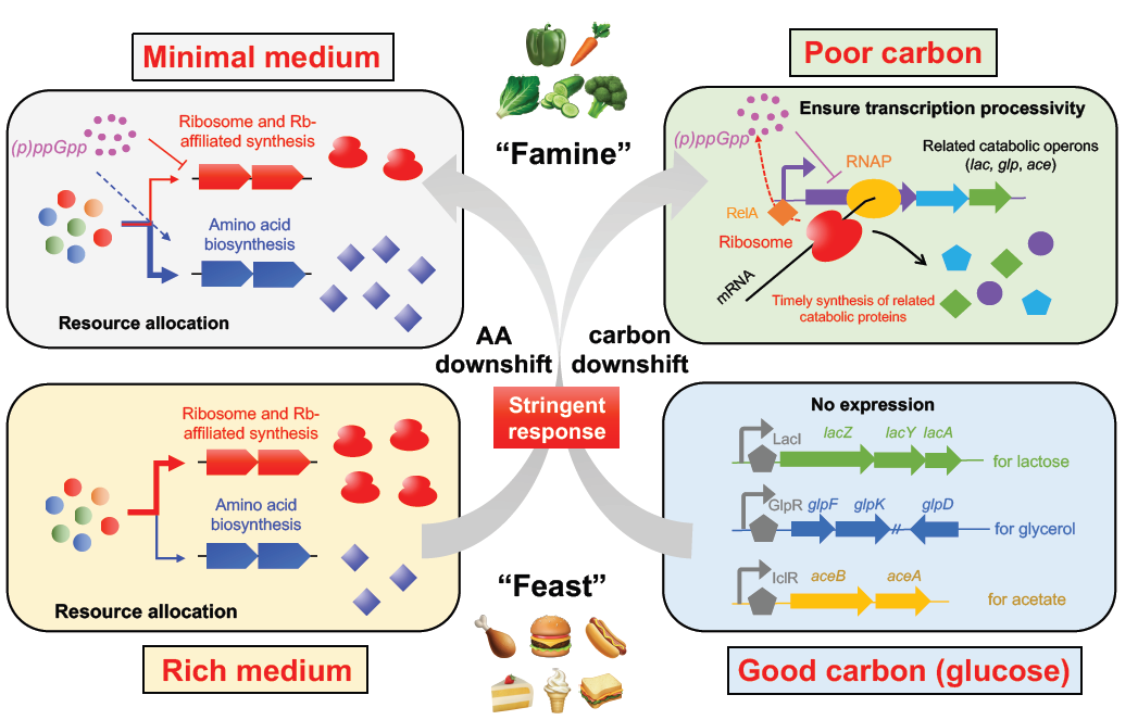 定量蛋白質組學研究表明,上調鳥苷四磷酸可以使得細菌全局蛋白質組資源配置從核糖體合成轉向氨基酸生物合成,進而促進細菌對氨基酸營養下調的生長適應,解釋了relA缺陷型菌株為何較野生型菌株需要更長的延滯期。另一方面,在碳源下調情況下,relA 缺陷型菌株由于缺乏鳥苷四磷酸嚴謹反應,導致轉錄-翻譯發生解偶聯,從而損害了轉錄延伸的持續性進而抑制了相關分解代謝操縱子的及時表達。總體來說,鳥苷四磷酸在細菌細胞生長中的調控作用類似于一枚硬幣的正反面:一方面它是細菌全局生長的抑制因子;另一方面它卻是推動細菌生長適應營養下調的促進因子。這項研究闡明了細菌在營養波動環境下保持適種群合度的重要策略。