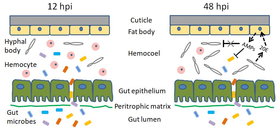 本研究發(fā)現(xiàn),萊氏綠僵菌(一種昆蟲病原真菌)感染棉鈴蟲后顯著增強(qiáng)了抗菌肽的表達(dá)和血漿的抗菌活性。同時,萊氏綠僵菌的感染使棉鈴蟲中腸受到破壞,導(dǎo)致腸道菌進(jìn)入血腔,這些入侵到血腔的腸道菌在血漿抗菌活性作用下被迅速清除。此外,這些上調(diào)表達(dá)的抗菌肽是由真菌感染導(dǎo)致,而非入侵到血腔的腸道菌誘導(dǎo)。棉鈴蟲血淋巴中的蛻皮激素滴度在真菌感染48小時后顯著升高,且誘導(dǎo)了抗菌肽基因的表達(dá)。這些抗菌肽(如cecropin 3和lebocin)能夠抑制入侵到血腔的腸道菌,但卻對真菌無抑制活性。進(jìn)一步研究發(fā)現(xiàn),入侵到血腔的腸道菌與真菌競爭血淋巴中的營養(yǎng)物質(zhì)。