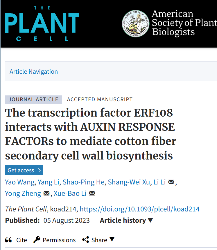 華大在線訊(通訊員 李揚)8月5日,植物學頂級期刊Plant Cell在線發表我校生命科學學院分子遺傳研究組題為“The transcription factor ERF108 interacts with AUXIN RESPONSE FACTORs to mediate cotton fiber secondary cell wall biosynthesis” (hppts://doi.org/10.1093/plcell/koad214)的研究論文,該研究揭示了AP2/ERF轉錄因子GhERF108與生長素響應因子GhARF7-1/7-2通過乙烯-生長素交互信號通路(ethylene-auxin signaling crosstalk)調控棉纖維SCW發育的新機制。