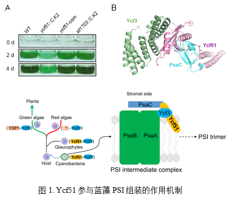 光合作用是生物地球化學循環的核心反應,是糧食產量的基礎,深入揭示光合作用的生物發生機制具有重要的理論與現實意義。藍藻是地球上最早出現的產氧光合生物,為葉綠體的演化祖先,是光合演化研究的“活化石”。相嵌于類囊體膜中的兩大色素蛋白復合體—光系統I(PSI)與光系統II(PSII),是實現光能轉化的關鍵分子機器,其生物發生機制一直是國際研究熱點。相較于PSII而言,PSI由于組裝過程極其迅速,其具體組裝機制仍不清楚。