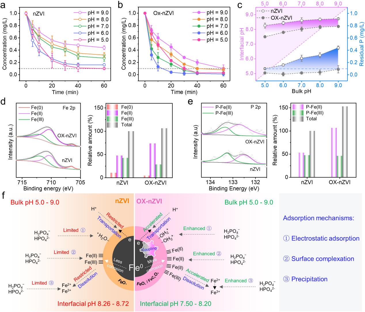 圖3 nZVI / OX-nZVI在不同初始pH值下的除磷性能、界面酸度與除磷機理