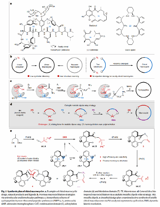 手性大環化合物作為藥物和功能材料的關鍵結構單元,其合成一直是有機化學領域的重大挑戰。以"人類抗生素最后防線"萬古霉素為例,其核心結構正是由軸手性聯芳基單元與大環內酯構成。傳統合成方法普遍面臨環化效率低、手性控制難等瓶頸問題,嚴重制約了這類化合物的開發應用。
