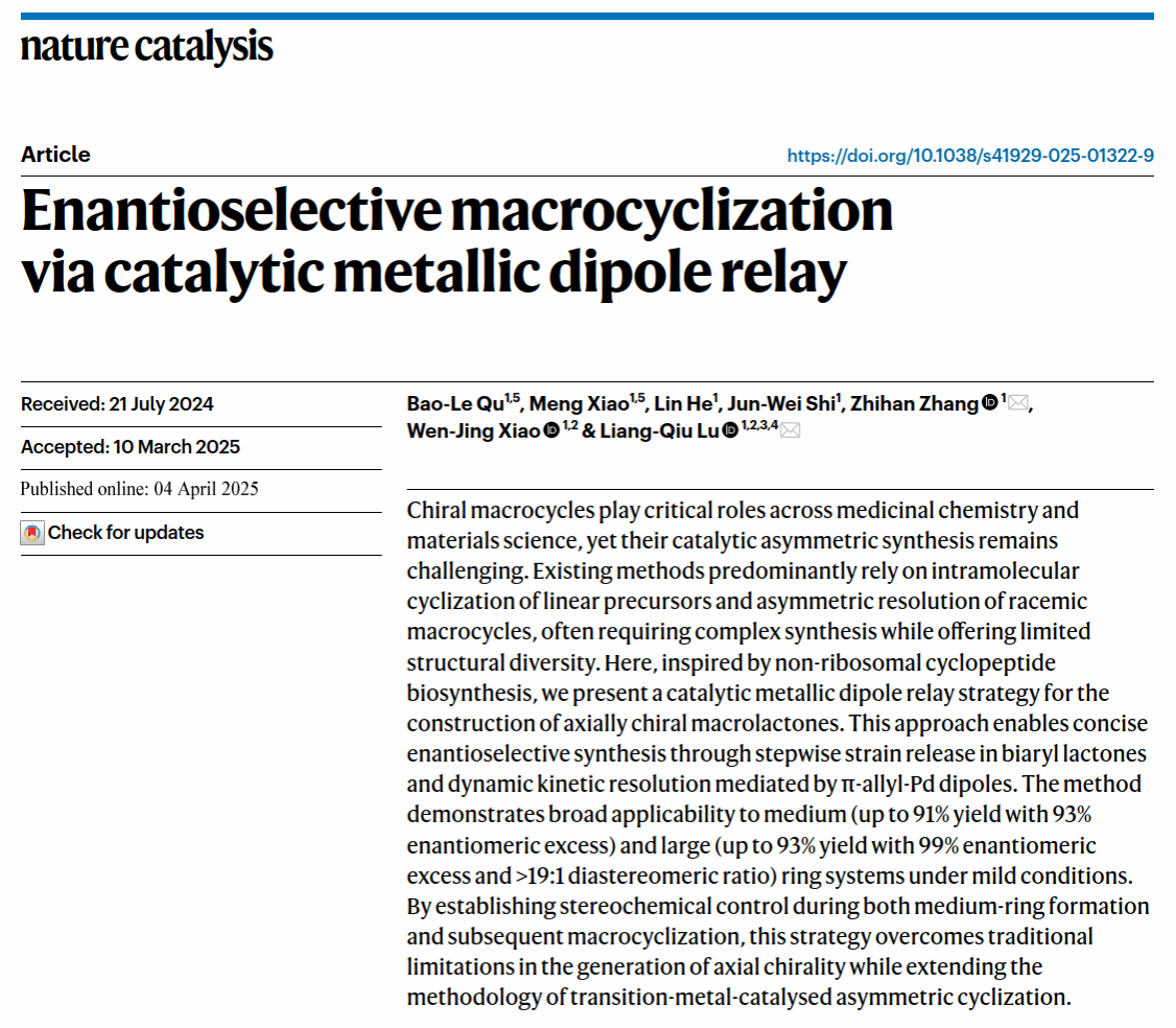 華大在線訊(通訊員 周漢鳴)4月4日,我校化學學院肖文精教授團隊在國際頂級期刊《自然催化》(Nature Catalysis)發表題為"催化的金屬偶極體接力實現對映選擇性大環化"(Enantioselective macrocyclization via catalytic metallic dipole relay)的研究論文。該研究創新性地提出了"金屬偶極體接力"策略,為軸手性大環化合物的高效合成開辟了新路徑。華中師范大學博士研究生曲寶樂(實驗研究)和肖萌(理論計算)為共同第一作者,陸良秋教授和張之涵教授為共同通訊作者,我校為第一完成單位。