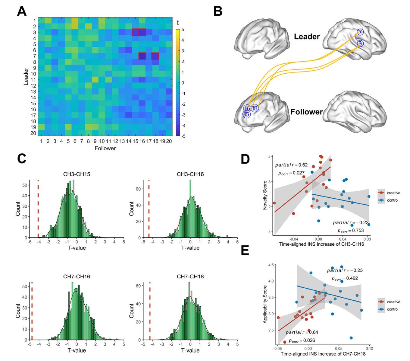 圖2:團體創造中思路引領者和追隨者的大腦間神經同步及其與觀點創造性的關系